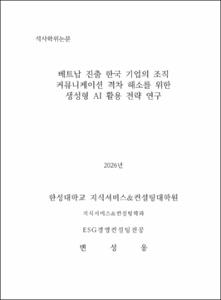 【주요어】베트남, 국외 기업, 생성형 AI, 커뮤니케이션, 갈등, 조직 분위기, 리더십|This study aims to empirically examine the communication barriers that arise between Korean supervisors and Vietnamese employees working in Korean enterprises operating in Vietnam, and to verify whether the use of generative artificial intelligence (AI) can alleviate such barriers and lead to a reduction in organizational conflict. In the research model, situational barrier improvement through the use of generative AI was set as the independent variable, while sender-related barrier improvement and receiver-related barrier improvement through the use of generative AI were set as mediating variables. Reductions in task conflict, process conflict, and relationship conflict were set as dependent variables, and organizational climate and supervisory leadership were set as moderating variables, as the effectiveness of communication barrier improvement through generative AI utilization may vary depending on these factors. To achieve the research purpose, a survey was conducted among Vietnamese employees working in Korean enterprises operating in Vietnam, and the collected data were analyzed using exploratory factor analysis, confirmatory factor analysis, reliability and validity testing, and structural equation modeling.