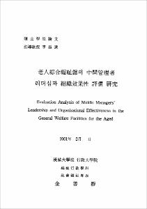 - Korea has recently a new problem which resulted from the speedy entrance into an aging society. The population trend of the speedy entrance into an aging society has become a big social problem. It is true that the aged who spent their lives only working when young is now neglected in society. Even though our traditional consciousness of filial piety is a social and cultural power of action in comparison with other countries, we have come to realize its limitation in the realities of life. Therefore, we consider the effective use of old men's leisure as the primary element for raising the quality of the old men's life. In this respect, the general welfare facilities for the aged has drawn many attention because many people want to make sure that the facilities are doing its own function of the aged people's leisure facilities. So we become interested with the "organizational effectiveness evaluation". Also, it has an important meaning that a middle manager leadership actually functions well for the purpose of complementing the drawbacks of the system and the policy.