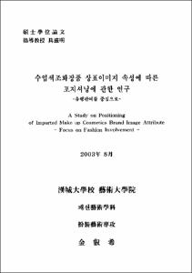 - 본 연구의 목적은 유행관여도 수준에 따른 수입색조화장품의 상표인지도와 상표이미지 속성 중요도의 차이를 밝히고, 상표이미지 속성에 따라 수입색조 화장품 상표를 다차원 공간상에 포지션닝하는 것이다.